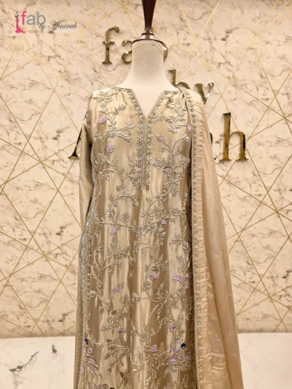 Experience the epitome of bridal elegance with this exquisite Chogha. The Pure Raw Silk Chogha is meticulously crafted with intricate Zardozi embroidery, featuring beautiful trellis and horse motifs.