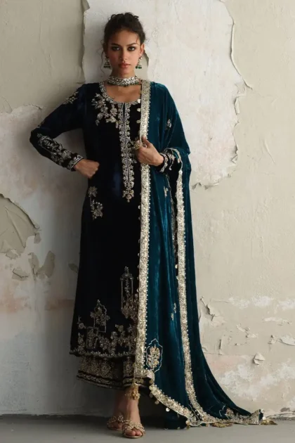Make a sophisticated statement with this elegant black hand-embroidered dress, a true masterpiece designed by Fab by Amirah. This ensemble combines timeless style with modern artistry, featuring a straight-cut shirt and trousers crafted from a rich black fabric, likely velvet, that offers a luxurious feel.