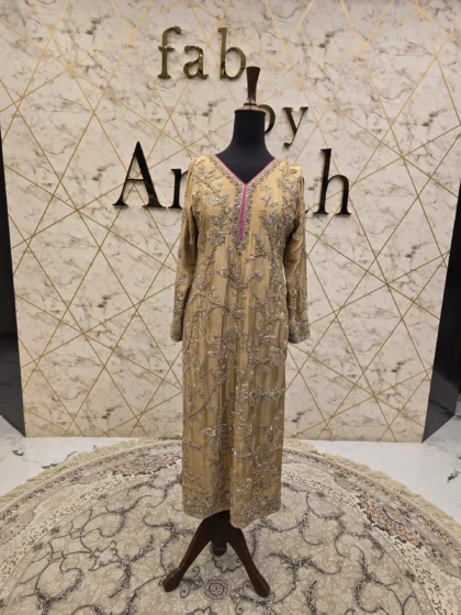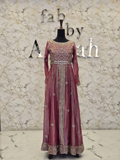 Make a striking impression at your next party with our stunning reddish Mehroon party wear dress. Meticulously handcrafted with intricate embroidery, this dress is a true work of art.