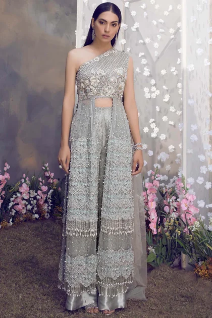 This exquisite Western Cut Embroidered dress, fully worked in Kutdana and pearls, is a masterpiece of handcrafted elegance. Kutdana, a traditional embroidery technique that involves stitching intricate patterns with sequins and beads, adds a touch of opulence and glamour to the dress.