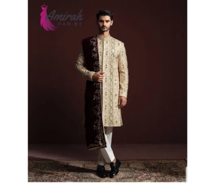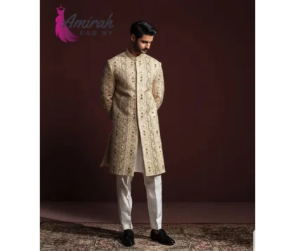 Our Hand Embroidered Off White Sherwani is more than just an outfit; it’s a statement of style and sophistication. Experience the epitome of luxury and elegance with this extraordinary piece.
